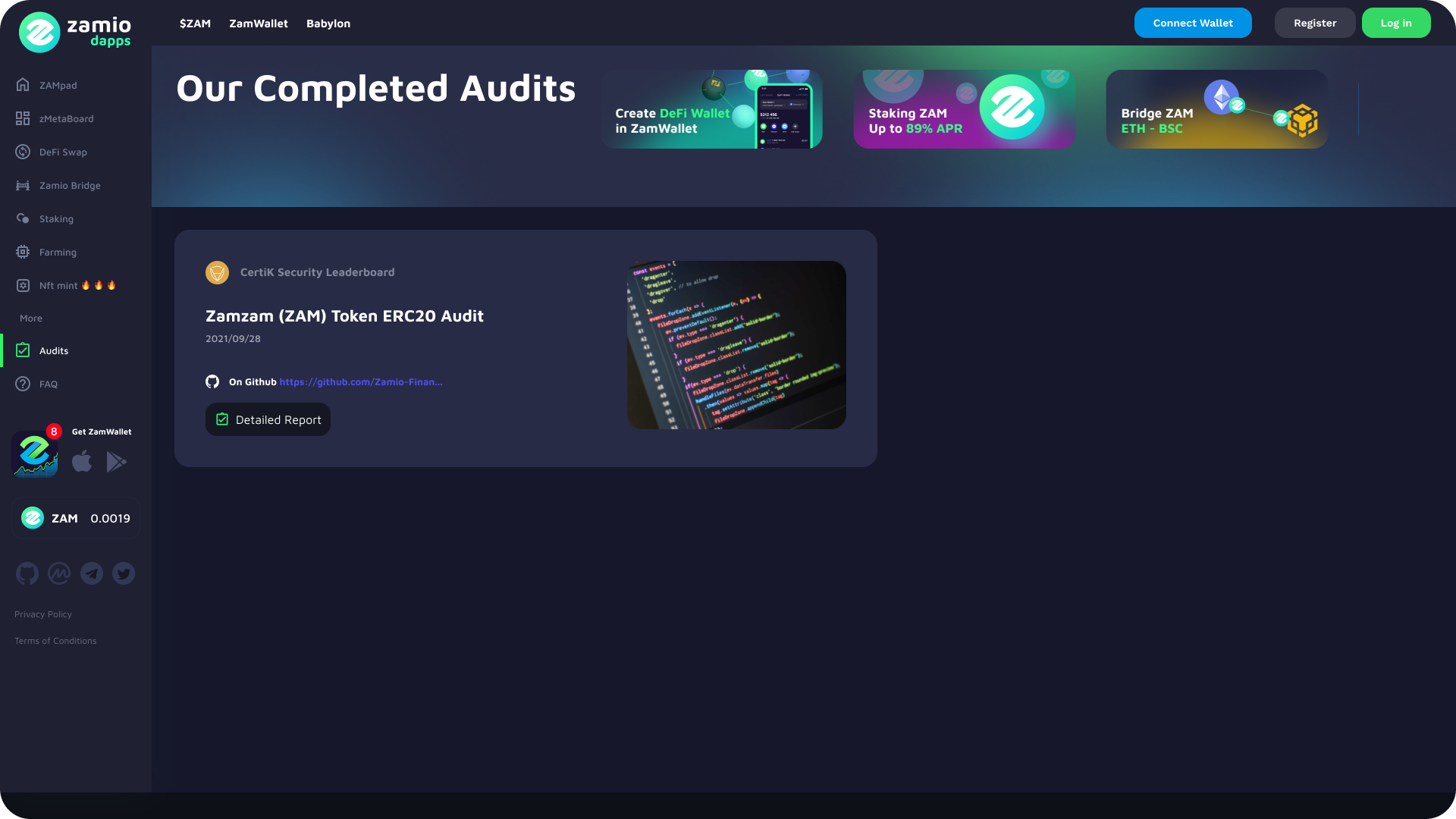 Audits unit belongs to informative ones. The Audit page will display all audits and certifications passed by Zamio ecosystem or its products. Users can thoroughly get acquainted with all provided information, and verify documents.