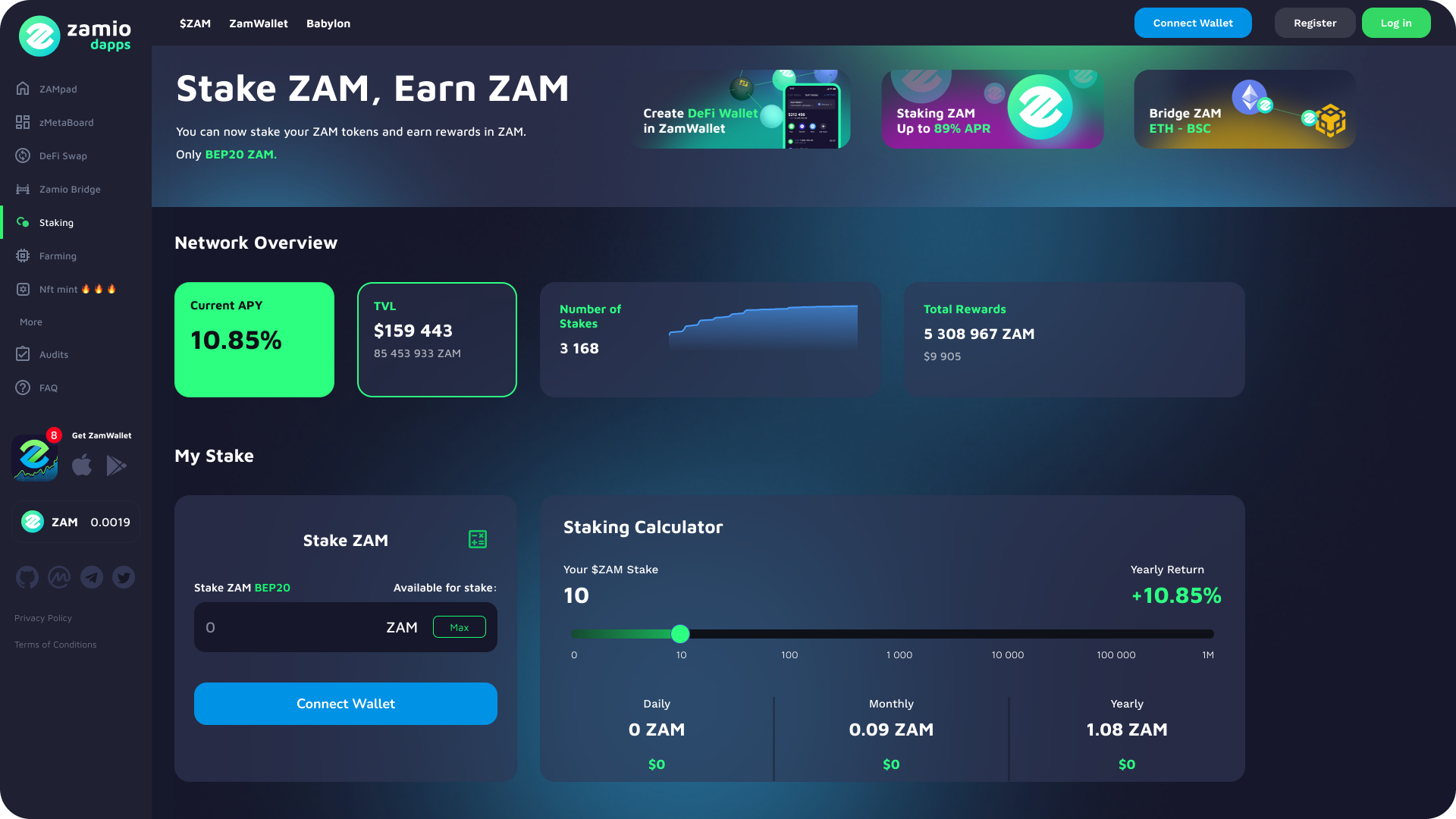 Users receive yield by holding ZAM. Yield Program (Staking) Pool in the amount of 204,444,444 tokens would be locked by smart contracts for about 5 years. Yield Program (Staking) Pool will be regulated by an algorithm, therefore, yield tokens would be automatically unlocked and distributed according to the current APY (annual percentage yield for holding).