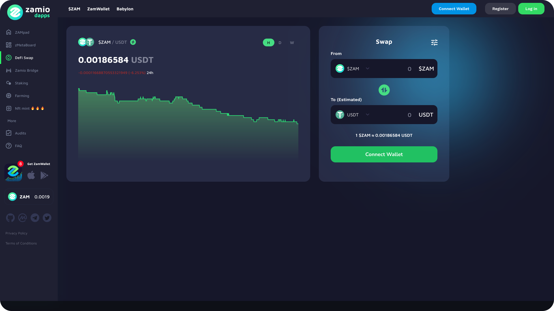 Zamio dApps is an inseparable part of the ecosystem with desktop and web-client availability. Dapps contains all necessary functionality for working decentralized finances and crypto-assets. It allows users to connect/manage cryptocurrency wallets, swap assets, invest and monitor platform information.